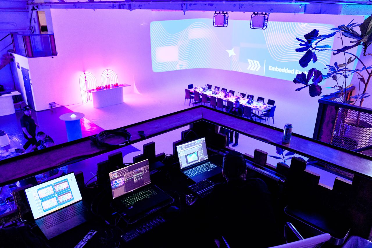 CONCEPT: For the second annual Embedded Exchange Dinner, Marqeta asked me to elevate the experience into a full tech-driven spectacle, transforming Capitol Arts’ photography studio into an immersive, projection-mapped environment for execs. Partnering with Foxtail Catering and Duster Electronics, the white cyc was reimagined as a dynamic visual landscape that shifted throughout the multi-course meal. The evening opened with LED-lit appetizer trays, dry-ice-plumed crudités, and a DIY bar where guests crafted their own cocktail bitters or syrups—setting the tone for a night centered around experimentation and sensory play.